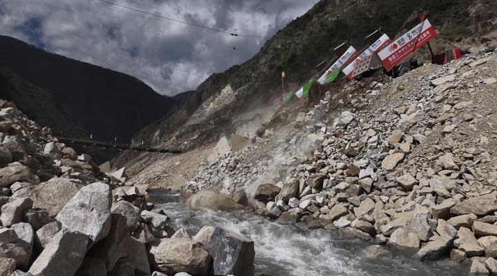 牙根一级水电站龙口合龙即将成功,数十辆自卸汽车来回不间断运输石料进行填筑。新华社发