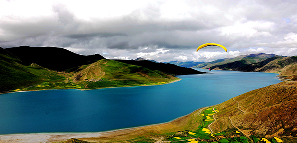羊卓雍错,西藏三大圣湖之一,被藏族人们看作是“神女散落的绿松石耳坠”。不同季节、不同时刻,形成不同的层次、不同的元素、不同的景致。黄色的滑翔伞突然入画,又增添了几分生机与动感。