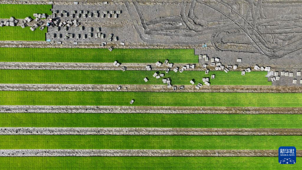 河北省唐山市丰南区西葛镇西葛村农民在田间搬运水稻秧苗(无人机照片)。新华社发(李秀清摄)