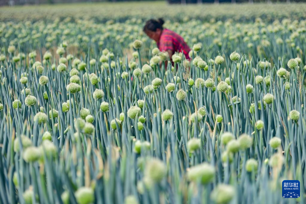 5月21日,在山东省青州市黄楼街道孙家村,农民在管护大葱。新华社发(王继林摄)