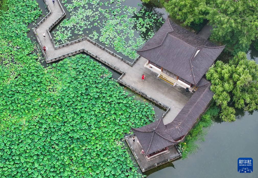 游客在浙江省湖州市长兴县泗安镇仙山湖国家湿地公园观赏睡莲(无人机照片)。
