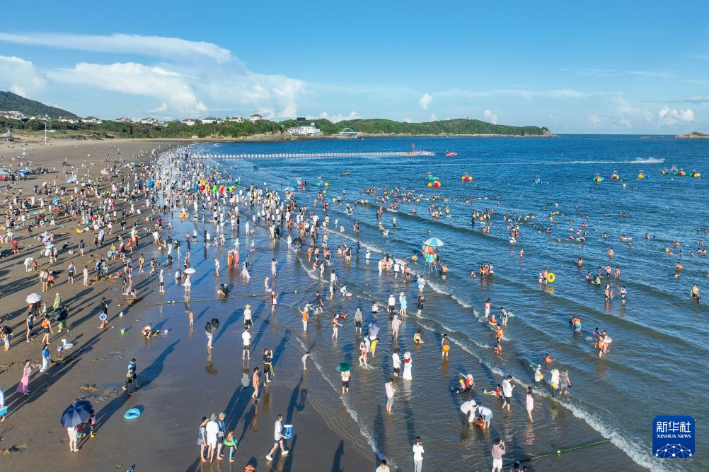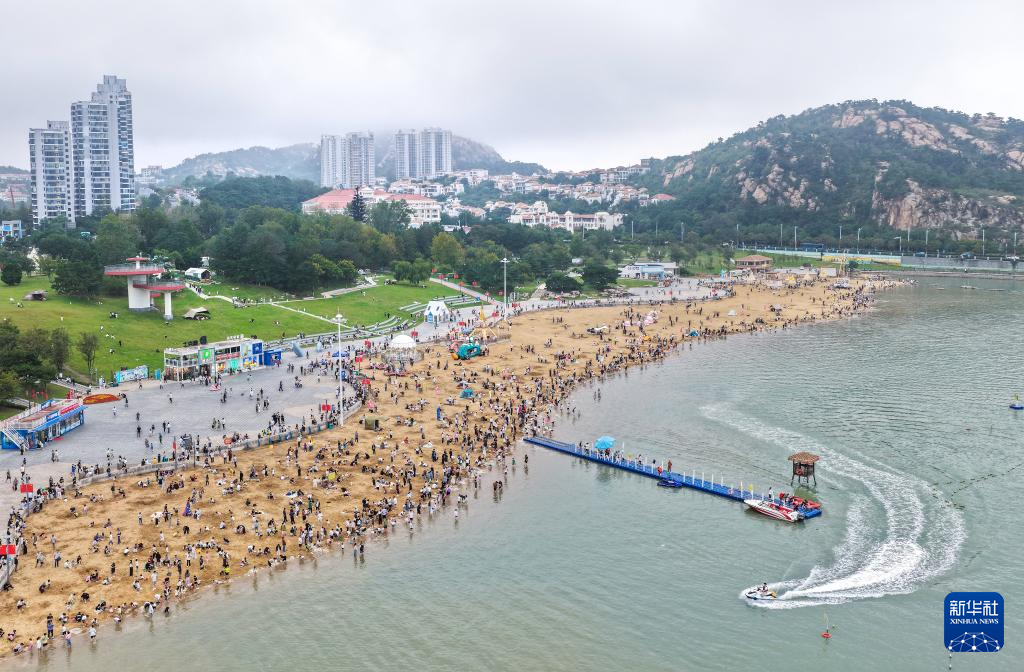 10月2日,游客在浙江省舟山市朱家尖南沙景区游玩(无人机照片)。