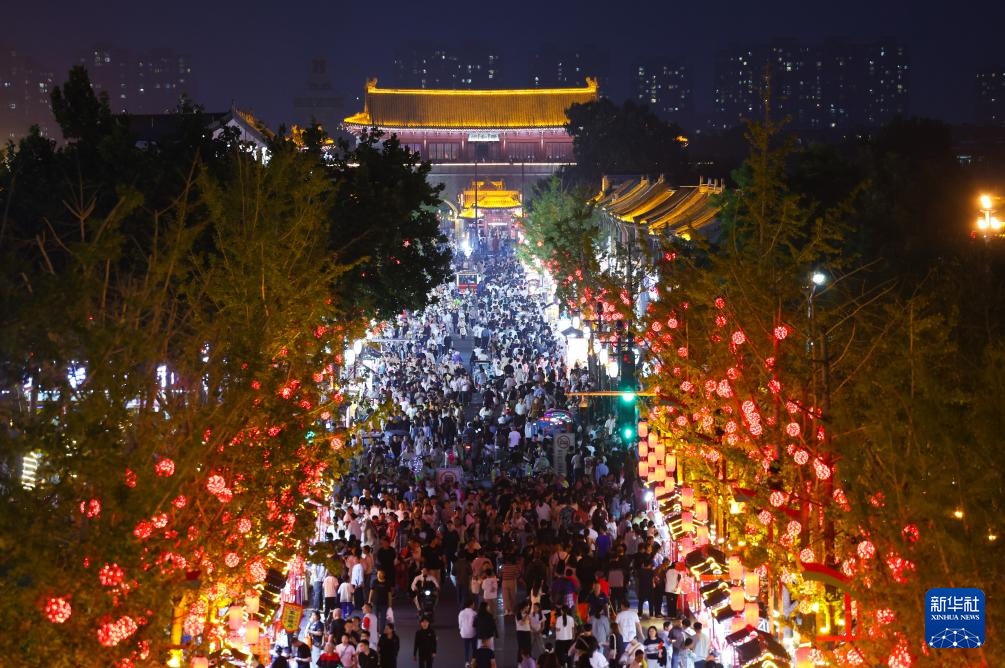 10月5日,游客在宁夏银川市鼓楼步行街游玩(无人机照片)。