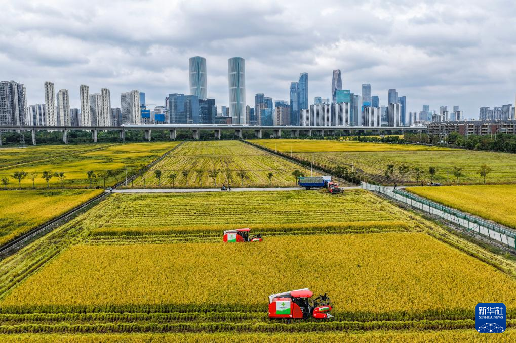 金秋时节,位于浙江杭州萧山区世纪田园粮食功能区的3000多亩水稻迎来丰收,金黄的稻田、飞驰而过的高铁列车和远处的城市天际线构成了独特的城市田园画卷。