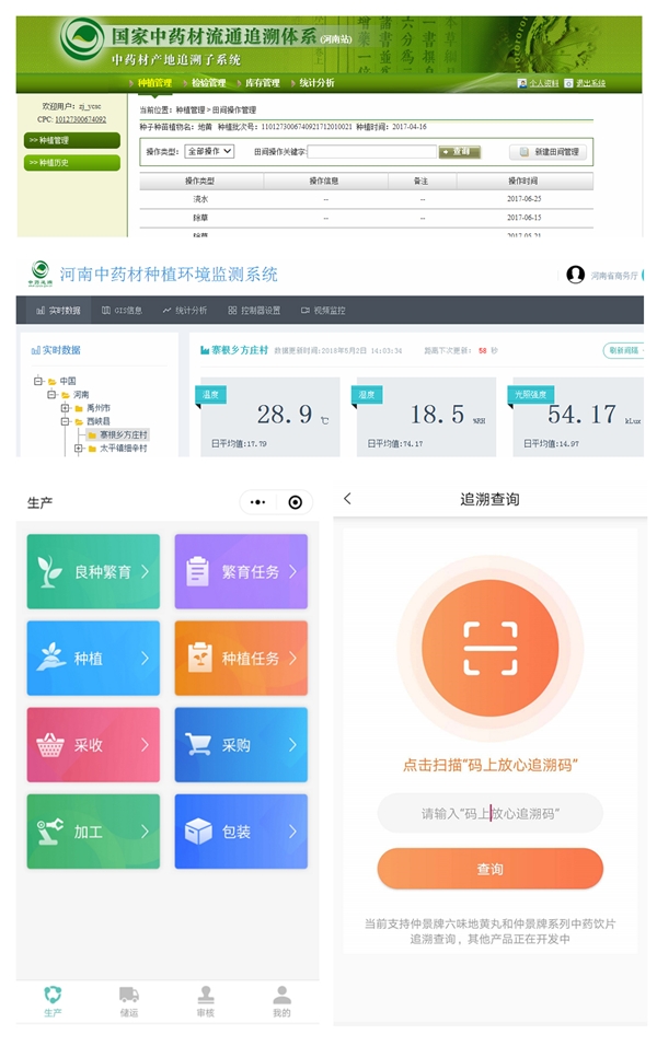 依托國家中藥材流通追溯體系、河南中藥材種植環(huán)境監(jiān)測系統(tǒng)、宛西制藥ERP信息系統(tǒng),企業(yè)建成中藥材及中成藥生產(chǎn)流通可追溯體系,實(shí)現(xiàn)從基地藥材、中藥飲片、生產(chǎn)過程、質(zhì)量檢測、市場流通全流程的業(yè)務(wù)管理和質(zhì)量溯源管理。通過機(jī)制創(chuàng)新、優(yōu)化流程,實(shí)現(xiàn)統(tǒng)一管理,滿足強(qiáng)化企業(yè)質(zhì)量管控。