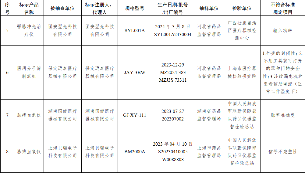 (五)医用脉搏血氧仪3台:分别为湖南国健医疗器械有限公司、上海贝瑞电子科技有限公司、重庆如泰科技股份有限公司生产,涉及脉率准确度、信号不完整性不符合标准规定。