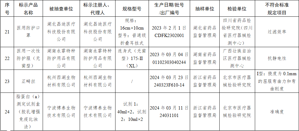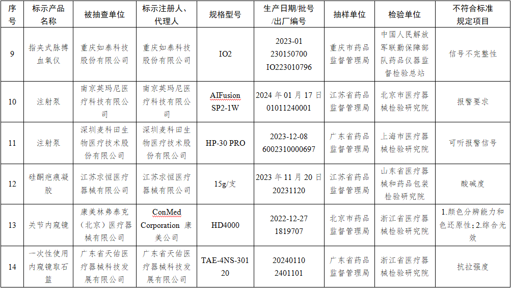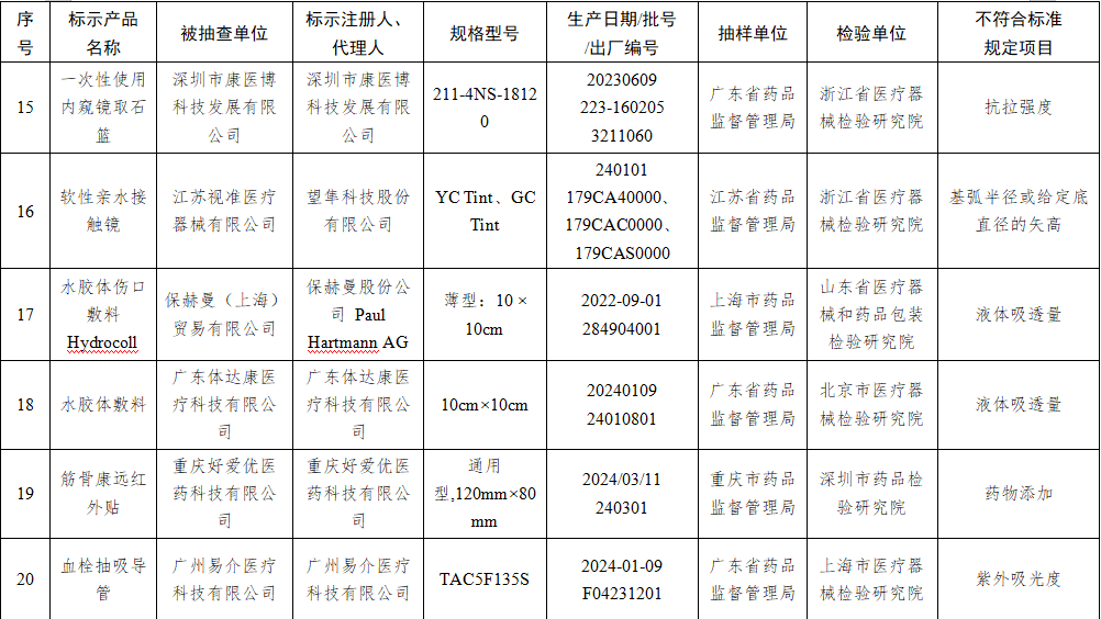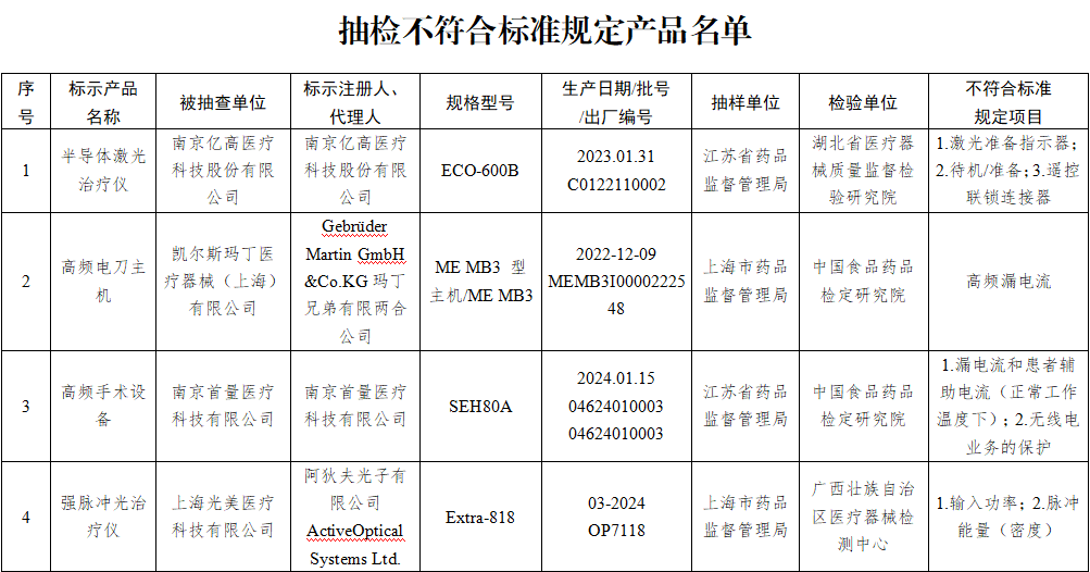 9月12日,国家药监局发布关于国家医疗器械监督抽检结果的通告(2024年第35号)。通告称,为加强医疗器械监督管理,保障医疗器械产品质量安全有效,国家药品监督管理局组织对半导体激光治疗机、疤痕修复凝胶等17个品种进行了产品质量监督抽检,有24批(台)产品不符合标准规定。具体情况通告如下: