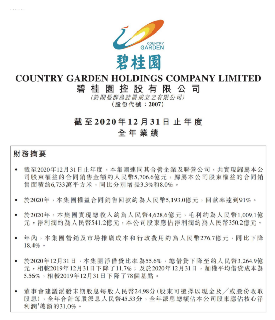 公告顯示,全年碧桂園營(yíng)業(yè)收入4628.6億元,毛利約為1009.1億元,凈利潤(rùn)541.2億元。得益于公司持續(xù)加強(qiáng)對(duì)回款目標(biāo)的考核,強(qiáng)化標(biāo)準(zhǔn)化、精細(xì)化的管理機(jī)制,碧桂園的回款率依舊保持高位。截至期末,共實(shí)現(xiàn)權(quán)益合同銷售現(xiàn)金回款額約人民幣5193億元,權(quán)益回款率達(dá)91%,連續(xù)五年高于90%,在行業(yè)繼續(xù)保持領(lǐng)先,反映了強(qiáng)勁的自身造血功能。