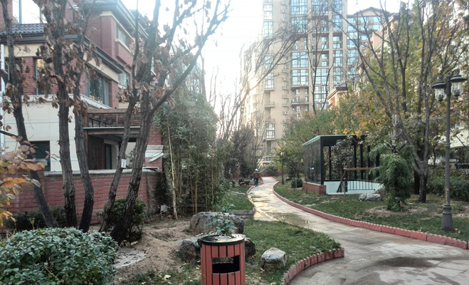 小區(qū)內干凈、整潔,綠樹成蔭,但由于小區(qū)的體量較小,綠化、水系等景觀設計等均讓人感覺略顯局促。