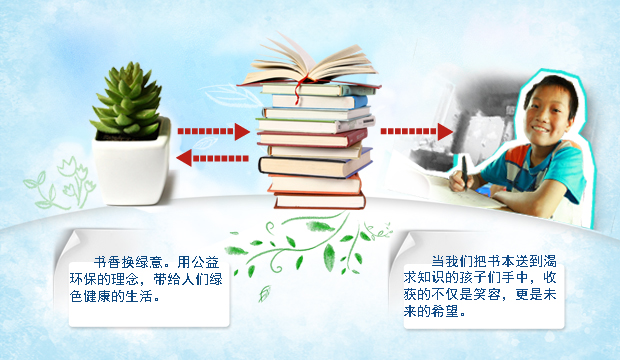 | 在新華房產(chǎn)“圖書(shū)換綠植”大型系列公益活動(dòng)中,我們提倡用手邊的兩三本舊書(shū),來(lái)?yè)Q取一株綠色的小植物。我們會(huì)將這些書(shū)本送到貧困山區(qū)孩子們的手中,給予他們最渴求的知識(shí);我們也會(huì)給你的辦公桌前,留下一抹綠意,讓你在工作閑暇之余,放松心神。 |