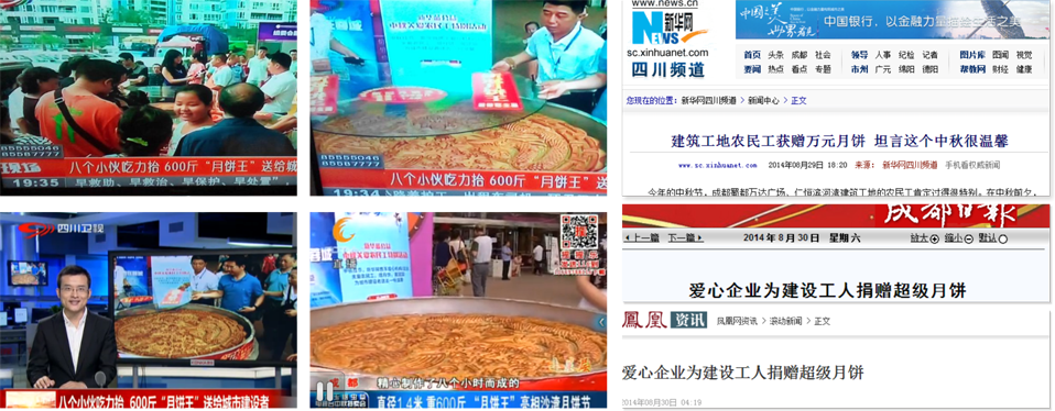 11:30許,在仁恒濱河灣建筑工地活動板房前,諾大的月餅已經擺放在農民工兄弟代表面前?!拔以缇吐犝f你們要來給我們送月餅,但是沒想到這個月餅居然這么大!”來自廣西的小姚不禁感嘆道。據記者了解,小姚雖然今年只有29歲,但是已經做建筑工人快10年了。2011年帶女兒一起來到成都,足足已有三年沒有和家人一起過中秋節(jié)了。