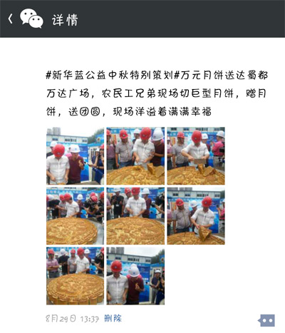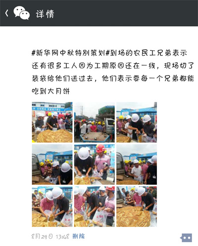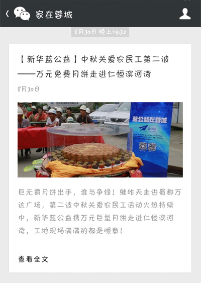 為了給這些身在異鄉(xiāng)的農民工兄弟送去溫暖,新華藍公益特別為他們舉辦了一場“中秋關愛農民工特別活動”,現場為工人捐贈月餅。8月29日上午10:30,本次活動在成都沙灣會展中心如期啟動。