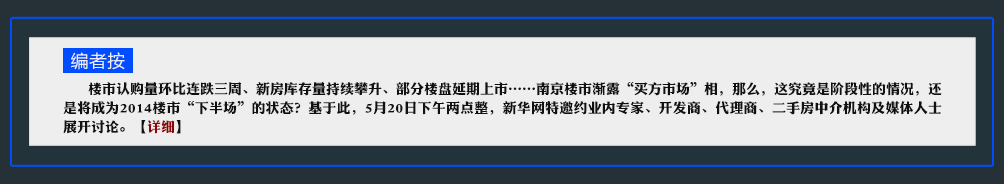???? 樓市認(rèn)購(gòu)量環(huán)比連跌三周、新房庫(kù)存量持續(xù)攀升、部分樓盤(pán)延期上市……南京樓市漸露“買(mǎi)方市場(chǎng)”相,那么,這究竟是階段性的情況?還是將成為2014樓市“下半場(chǎng)”的狀態(tài)?基于此,5月20日下午兩點(diǎn)整,新華網(wǎng)特邀約業(yè)內(nèi)專(zhuān)家、開(kāi)發(fā)商、代理商、二手房中介機(jī)構(gòu)及媒體人士展開(kāi)討論。