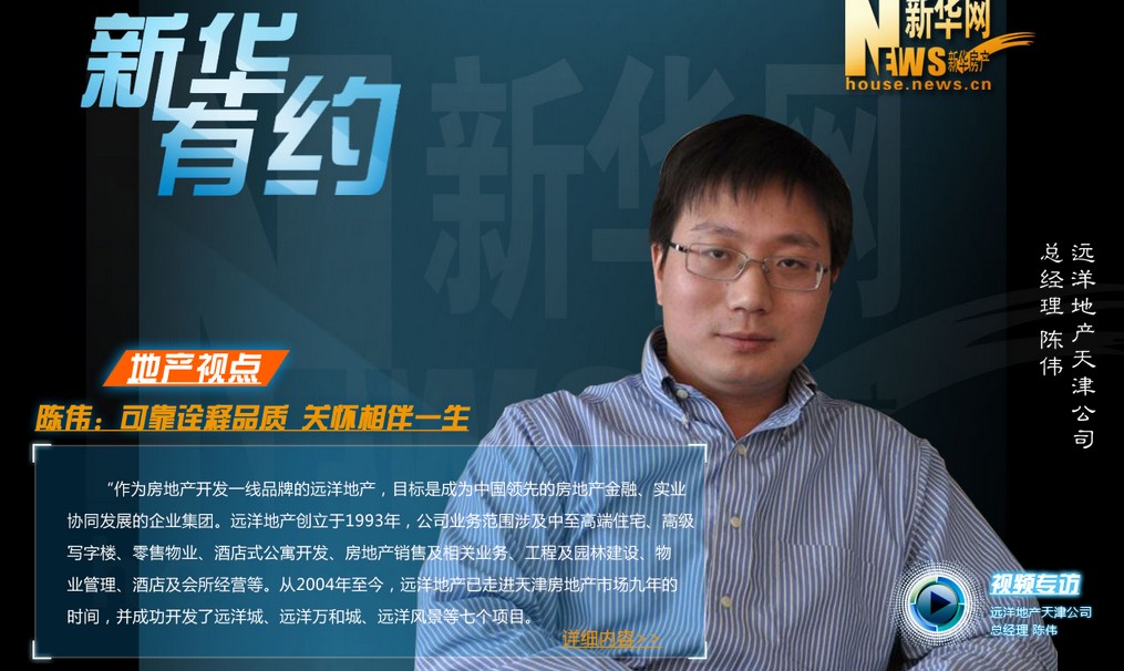 作為房地產(chǎn)開發(fā)一線品牌的遠(yuǎn)洋地產(chǎn),目標(biāo)是成為中國(guó)領(lǐng)先的房地產(chǎn)金融、實(shí)業(yè)協(xié)同發(fā)展的企業(yè)集團(tuán)。遠(yuǎn)2004年至今,遠(yuǎn)洋地產(chǎn)已走進(jìn)天津房地產(chǎn)市場(chǎng)九年的,并成功開發(fā)了遠(yuǎn)洋城、遠(yuǎn)洋萬(wàn)和城、遠(yuǎn)洋風(fēng)景等七個(gè)項(xiàng)目。新華網(wǎng)新華房產(chǎn)榮幸的邀請(qǐng)到遠(yuǎn)洋地產(chǎn)天津公司總經(jīng)理陳偉,共同分享遠(yuǎn)洋地產(chǎn)在天津的成長(zhǎng)之路。