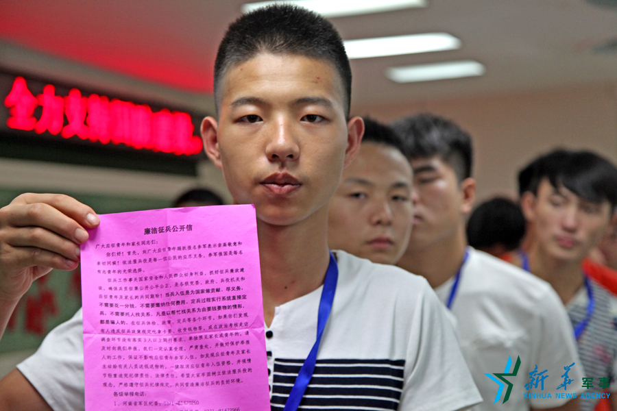 ????新華網(wǎng)鄭州8月11日電(雒根生)“當兵入伍是為國家做貢獻盡義務,不需要繳納任何費用。凡是以幫忙找關(guān)系為由要錢要物的情形,都是騙人的!”河南省武陟縣喬廟鄉(xiāng)18周歲的預征對象王云祥10日收到了武陟縣征兵辦印制的《廉潔征兵公開信》。為確保不發(fā)生一起違反征兵政策現(xiàn)象,武陟縣征兵辦公室專門印制1000份廉潔征兵公開信發(fā)放給每一位參檢對象及家長,并公布了省市縣三級監(jiān)督舉報電話。