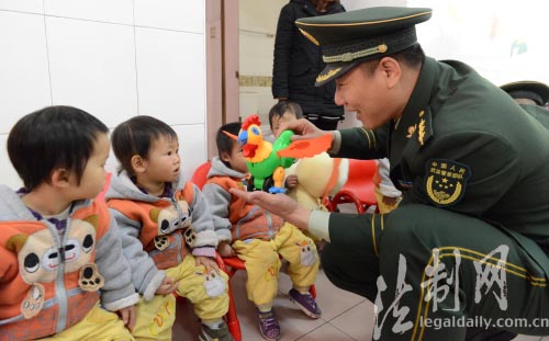 ????12月28日,廣東公安邊防總隊(duì)中山邊防支隊(duì)橫門水上邊防派出所聯(lián)合民眾鎮(zhèn)義工服務(wù)隊(duì)開展新年集體認(rèn)親活動(dòng),邊防官兵和義工人員走進(jìn)中山市兒童福利院與小朋友結(jié)對(duì)認(rèn)親,“兵爸爸”給“兒女們”送來了玩具、糖果、學(xué)習(xí)用品等新年禮物,并與“兒女們”一起玩老鷹抓小雞、有獎(jiǎng)問答、拍拍手等游戲,一家人用歡聲與快樂迎接新一年的到來。(肖亭 宗志鵬)