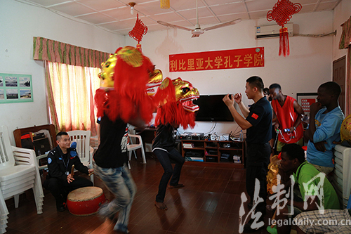 ????利比里亞時間4月23日,中國第五支駐利比里亞維和警察防暴隊應(yīng)邀到利比里亞大學孔子學院開展文化交流活動,并進行舞獅指導。