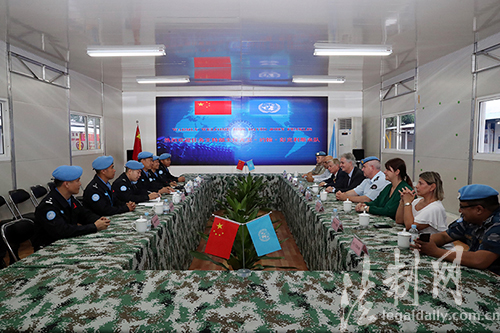 圖為維和警察防暴隊與聯(lián)利團任務(wù)支持部主任大衛(wèi)·約翰·彭克利斯一行開展座談交流