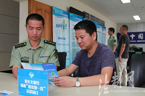 ????“您可以通過關(guān)注我們的微信公眾號‘紅色港灣’,及時(shí)了解證件辦理所需材料、注意事項(xiàng),避免由于手續(xù)不全多次往返?!贝┥竭叿罊z查站執(zhí)勤業(yè)務(wù)一科教導(dǎo)員莫曉涵在對前來辦理證件的船員家屬介紹到。8月5日,浙江公安邊防總隊(duì)穿山邊防檢查站立足職能,結(jié)合實(shí)際,在一線執(zhí)勤窗口扎實(shí)開展了“最多跑一次”宣傳活動(dòng)。