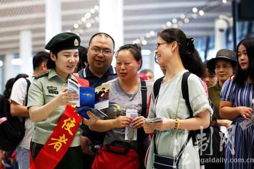 ????活動期間,該站在常州奔牛國際機場出境大廳張貼宣傳海報、發(fā)放宣傳畫冊、播放宣傳視頻,充分展示了該站近年來在提高邊檢服務(wù)水平、“法治邊檢”建設(shè)和執(zhí)法規(guī)范化等方面取得的工作成效,并通過有獎知識競答等互動方式,向廣大出入境旅客贈送印有“邊檢天天”卡通宣傳形象的遮陽帽、折扇、雨傘等紀(jì)念品,進一步普及邊檢出入境知識和政策法規(guī)。