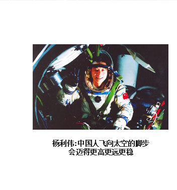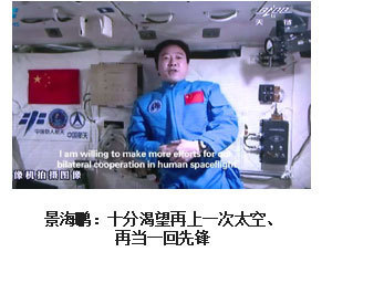 ??? 為了人類的和平與進(jìn)步,中國人來到了太空。2003年10月15日,我搭乘神舟五號飛船,在太空飛行14圈,歷時21小時23分,完成了中國首次載人航天飛行。雖然是獨自在太空飛行,但一想到億萬祖國人民翹首以待,我覺得不是一個人在飛。于是我拿起太空筆,在工作日志的背面寫上了這樣一句話:“為了人類的和平與進(jìn)步,中國人來到了太空”,并在艙內(nèi)鏡頭前向祖國人民、世界人民展示。“為了人類的和平與進(jìn)步”,是中國發(fā)展載人航天事業(yè)的初衷,“中國人來到了太空”既描述了一個歷史時刻,也表達(dá)了我為祖國航天事業(yè)感到無比自豪的心情。?