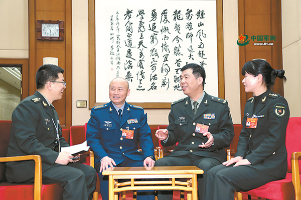 ????3月10日,解放軍報(bào)記者張軍勝(左一)采訪(fǎng)軍隊(duì)人大代表王獻(xiàn)軍、楊征、潘佳瑛(左二至左四)。解放軍報(bào)記者 穆可雙 攝