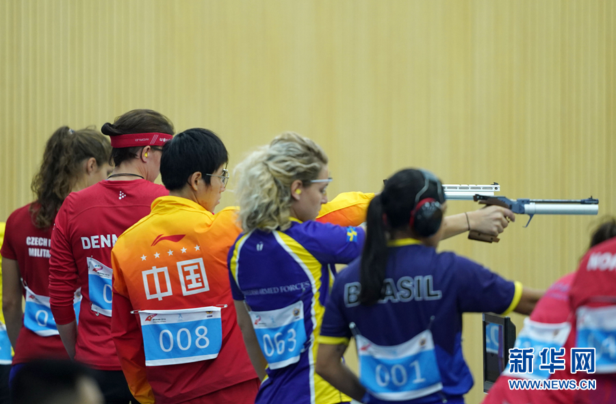 10月21日,中國(guó)隊(duì)選手王佳(左三)在比賽中。 當(dāng)日,在武漢舉行的第七屆世界軍人運(yùn)動(dòng)會(huì)空軍五項(xiàng)女子射擊比賽中,中國(guó)隊(duì)選手王佳獲得第一名。 新華社記者金良快攝