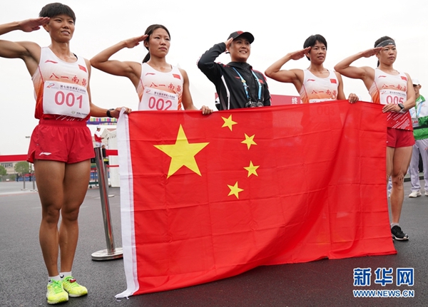 10月23日,中國隊成員在女子個人全能越野跑比賽后手持國旗敬禮。當日,第七屆世界軍人運動會女子個人全能項目比賽在武漢陸軍工程大學軍械士官學校結(jié)束,中國選手盧嬪嬪以5627.2分的總成績獲得冠軍,隊友管超楠以5567.6分的總成績獲得亞軍,王堂林以5506.3分的總成績獲得季軍,孫洪燕以5474.1的總成績獲得第四名。新華社記者 王建威 攝
