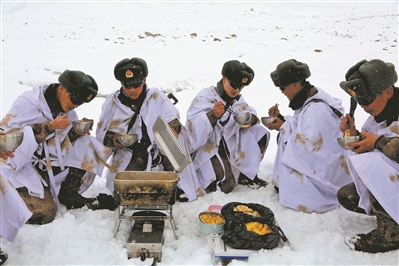 ????寒冬時(shí)節(jié),新疆喀什軍分區(qū)克克吐魯克邊防連官兵在巡邏途中吃上熱乎乎的飯菜。姬文志 攝