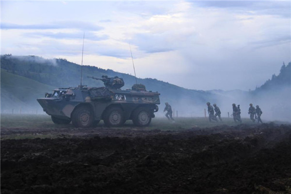 ????陸軍第83集團軍某旅紅一連官兵實兵利用戰(zhàn)車掩護向“敵”陣地發(fā)起沖鋒。新華社發(fā)(張增巖 攝)