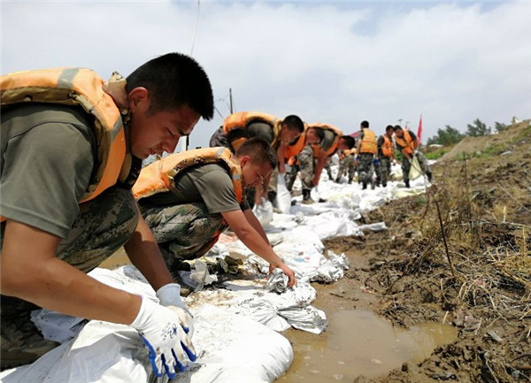 ????第71集團軍某旅工兵連官兵在江西九江柴桑區(qū)江洲鎮(zhèn)江新洲堤上展開搶險任務(wù)。新華社發(fā)(郭仁杰 攝)