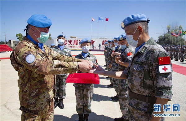 ????6月16日,中國第18批赴黎巴嫩維和部隊全體410名官兵被授予聯(lián)合國勛章,以表彰他們在任務(wù)期內(nèi)為維護黎巴嫩南部地區(qū)和平與穩(wěn)定做出的突出貢獻。新華社發(fā)(彭希 攝)