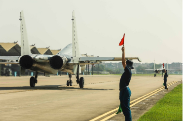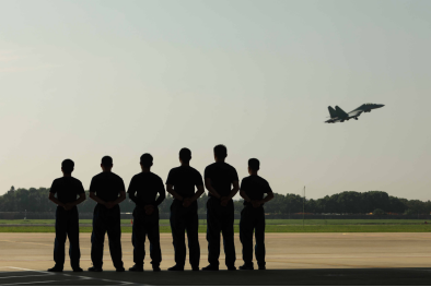华东某机场,一发信号弹撕裂长空。东部战区航空兵某旅一场跨昼夜、高强度实战化对抗训练,在震天轰鸣中拉开战幕。数架战机依次加力滑跑,如利剑出鞘直刺苍穹,在空中迅速完成战术编组。