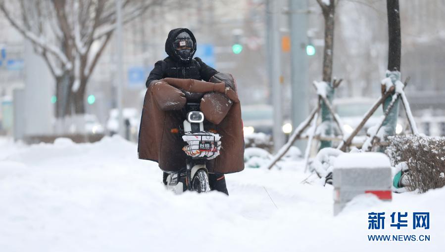 1月28日,在沈陽(yáng)市渾南區(qū),市民在積雪中騎行。