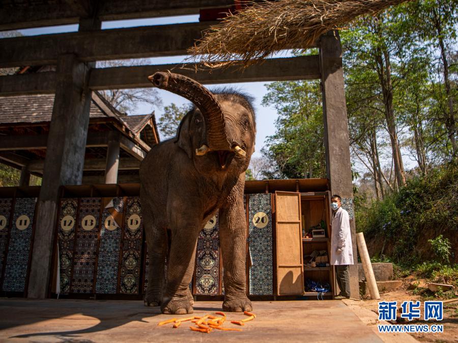 “象爸爸”為一頭名叫“小強(qiáng)”的大象測量體重(3月6日攝)。新華社記者 江文耀 攝