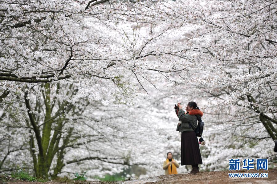 春季里,貴州省貴安新區(qū)紅楓湖畔的櫻花園內(nèi)櫻花綻放,花海如云似雪,吸引游人踏春賞櫻。