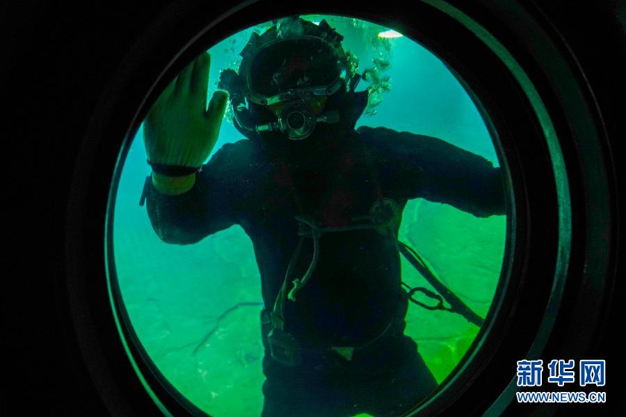 3月15日,在長(zhǎng)江水下40多米的白鶴梁題刻無壓容器罩內(nèi),潛水員在對(duì)參觀廊道的觀察窗玻璃進(jìn)行清理。新華社記者 劉潺 攝