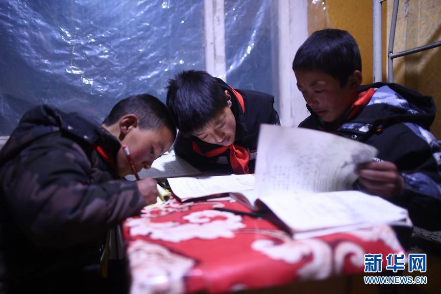 3月16日,在索加鄉(xiāng)寄宿小學(xué),羅松東?。ㄖ校┖托』锇樵谒奚醿?nèi)溫習(xí)功課。新華社記者 張宏祥 攝