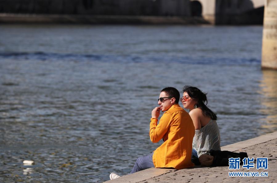 3月24日,一對(duì)情侶在法國(guó)巴黎塞納河畔曬太陽。