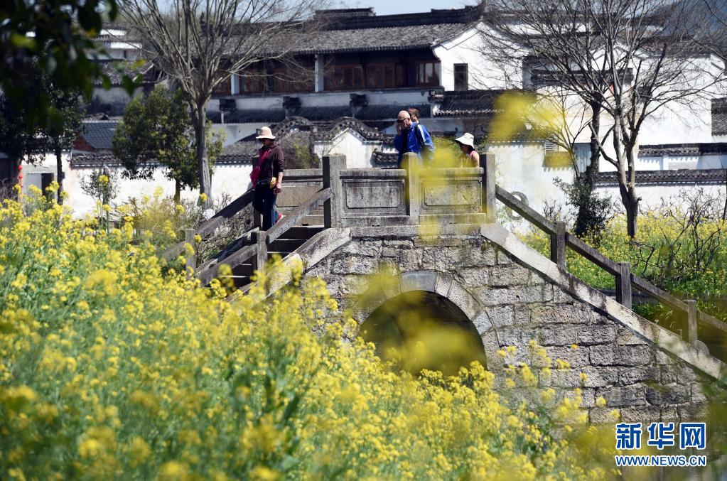 3月26日,游客在安徽省黃山市徽州區(qū)呈坎古村踏青游覽。