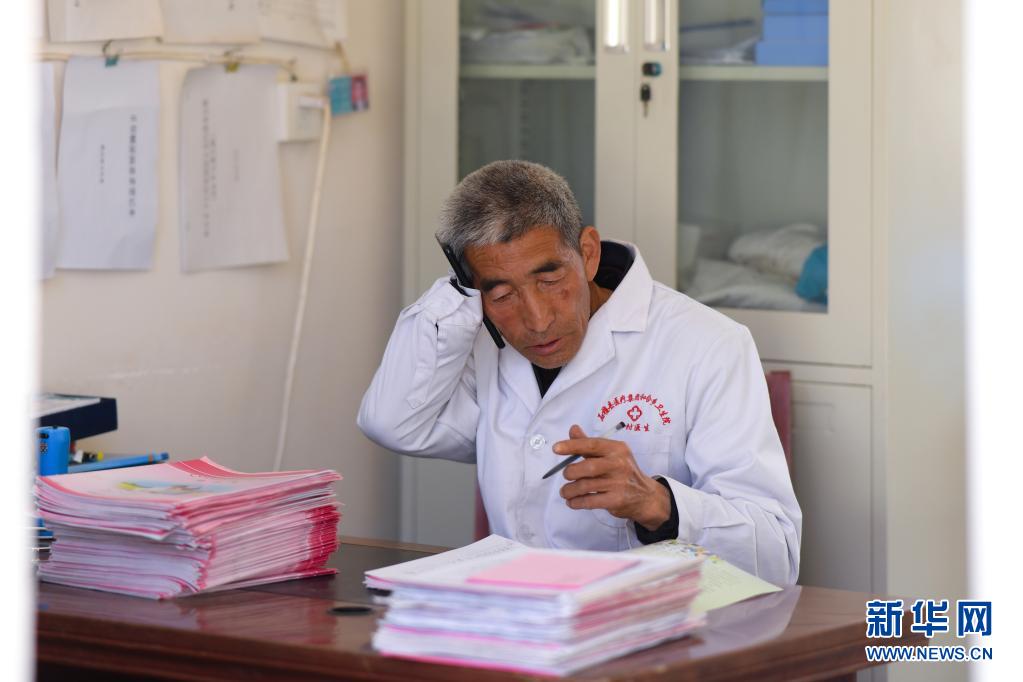 在山西省石樓縣鐵頭村衛(wèi)生室,張尚保在接聽詢?cè)\電話(3月24日攝)。新華社發(fā)(劉亮亮 攝)