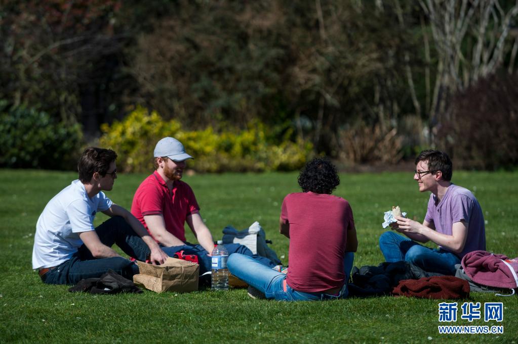 3月29日,人們在英國倫敦攝政公園的草地上野餐。