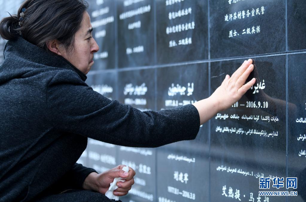 4月3日,在烏魯木齊市革命烈士陵園,瑪依努爾撫摸鐫刻在新疆公安英烈紀念碑上艾熱提的名字。