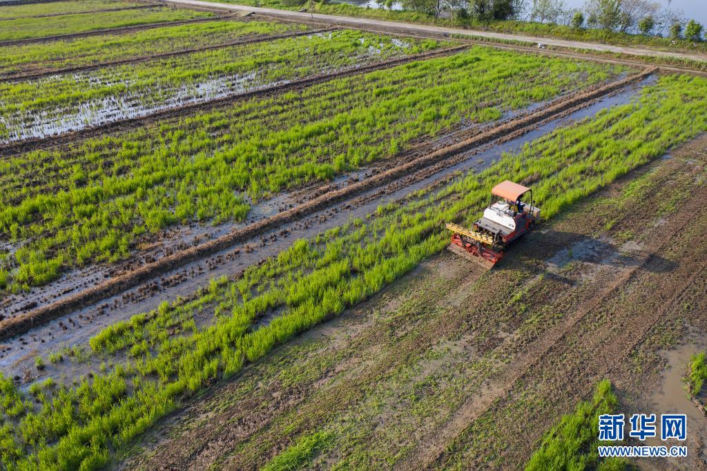 4月5日,浙江紹興諸暨市次塢鎮(zhèn)紅旗村紅旗合作社農(nóng)民駕駛農(nóng)機在翻耕農(nóng)田,準備播種早稻(無人機照片)。