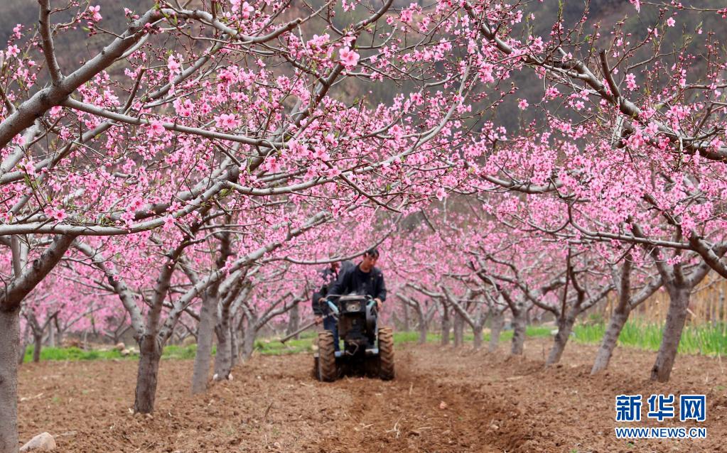 4月5日,河北省石家莊市井陘縣測魚鎮(zhèn)楊莊村村民駕駛農(nóng)機在桃園里作業(yè)。