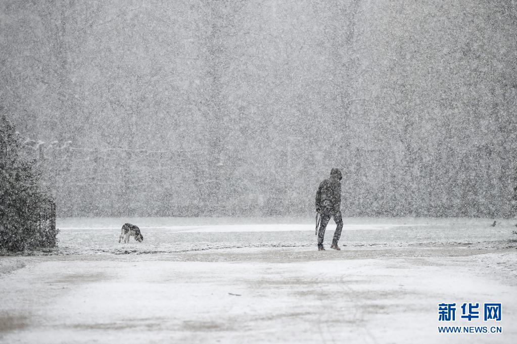 4月6日,一名市民在比利時(shí)布魯塞爾五十周年紀(jì)念公園冒雪遛狗。