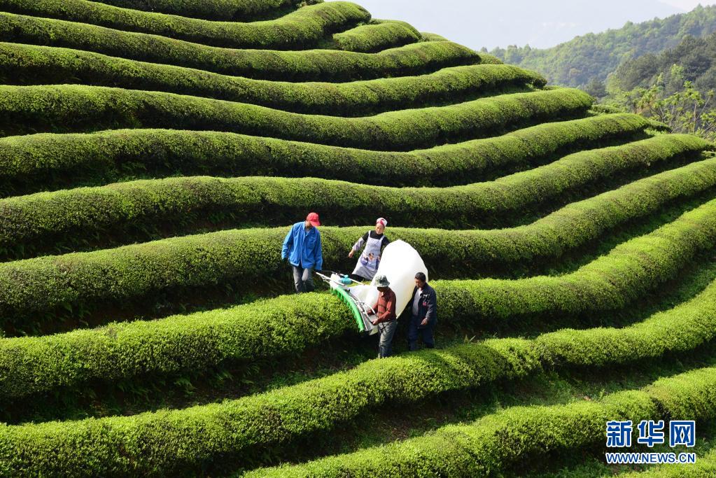 4月6日,浙江杭州建德市的茶農(nóng)操作采茶機(jī)采收春茶青葉。