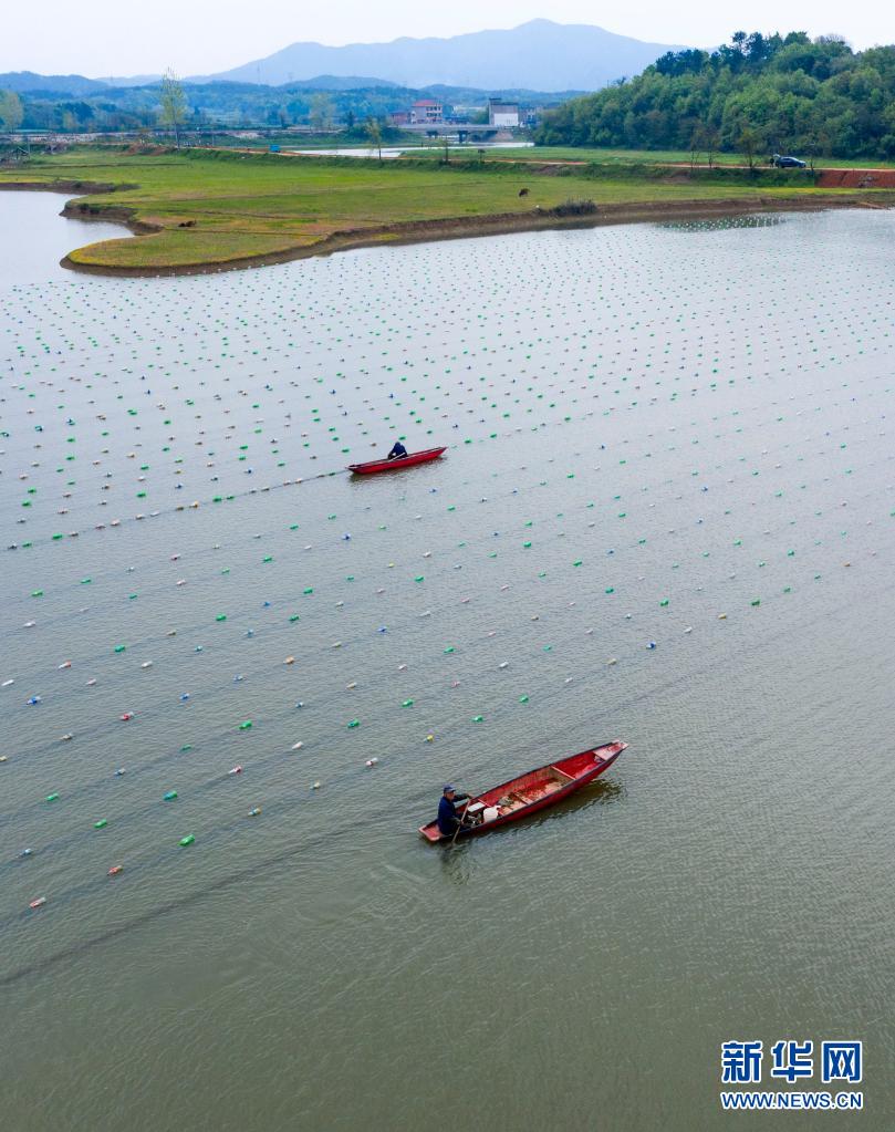 4月6日,在江西省九江市都昌縣新妙湖畔珍珠養(yǎng)殖基地,蚌農(nóng)在投放珍珠蚌(無人機(jī)照片)。