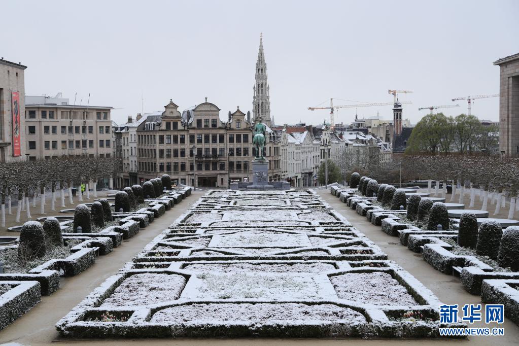 比利時近日迎來春雪,首都布魯塞爾銀裝素裹,景色別致。