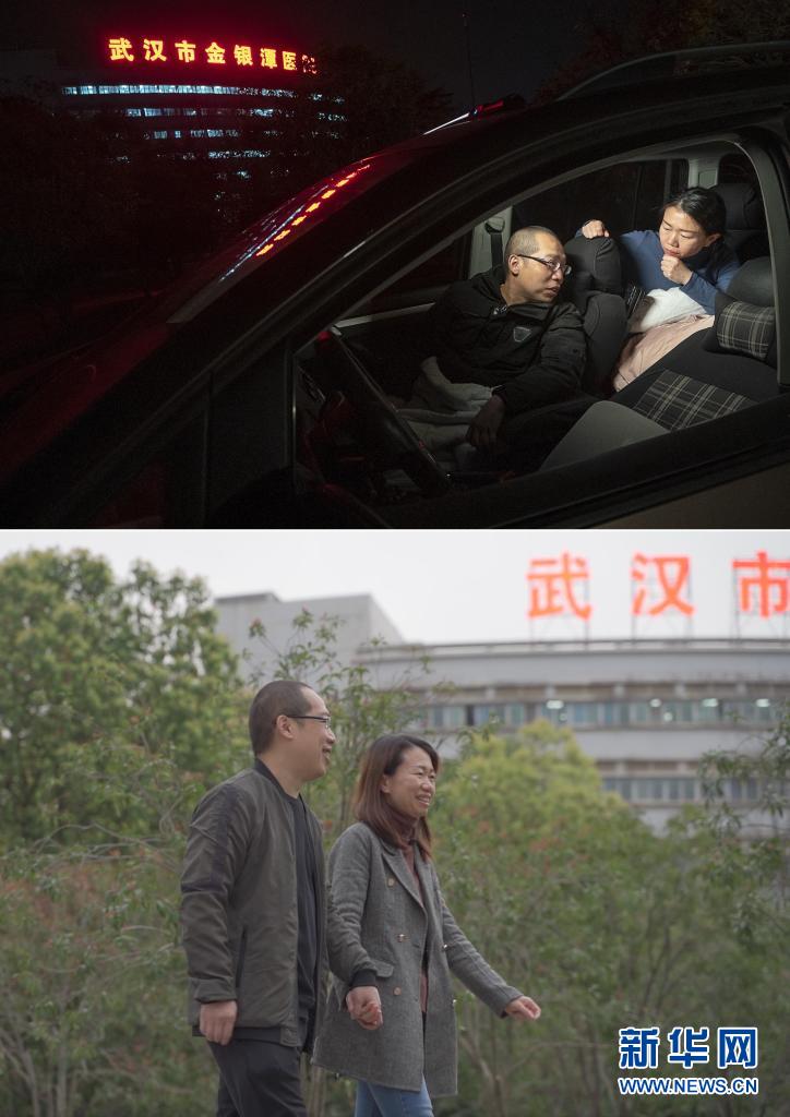這是一張拼版照片,上圖為:2020年2月22日晚,武漢市金銀潭醫(yī)院的醫(yī)護(hù)夫妻涂盛錦(左)與曹珊在車(chē)內(nèi)聊天。從大年初一開(kāi)始,兩人就住進(jìn)車(chē)?yán)?,為在疫情中搶救病患,?zhēng)分奪秒,以車(chē)為家;下圖為:3月23日,武漢市金銀潭醫(yī)院的醫(yī)護(hù)夫妻涂盛錦和曹珊在下班路上。新華社記者 熊琦 攝